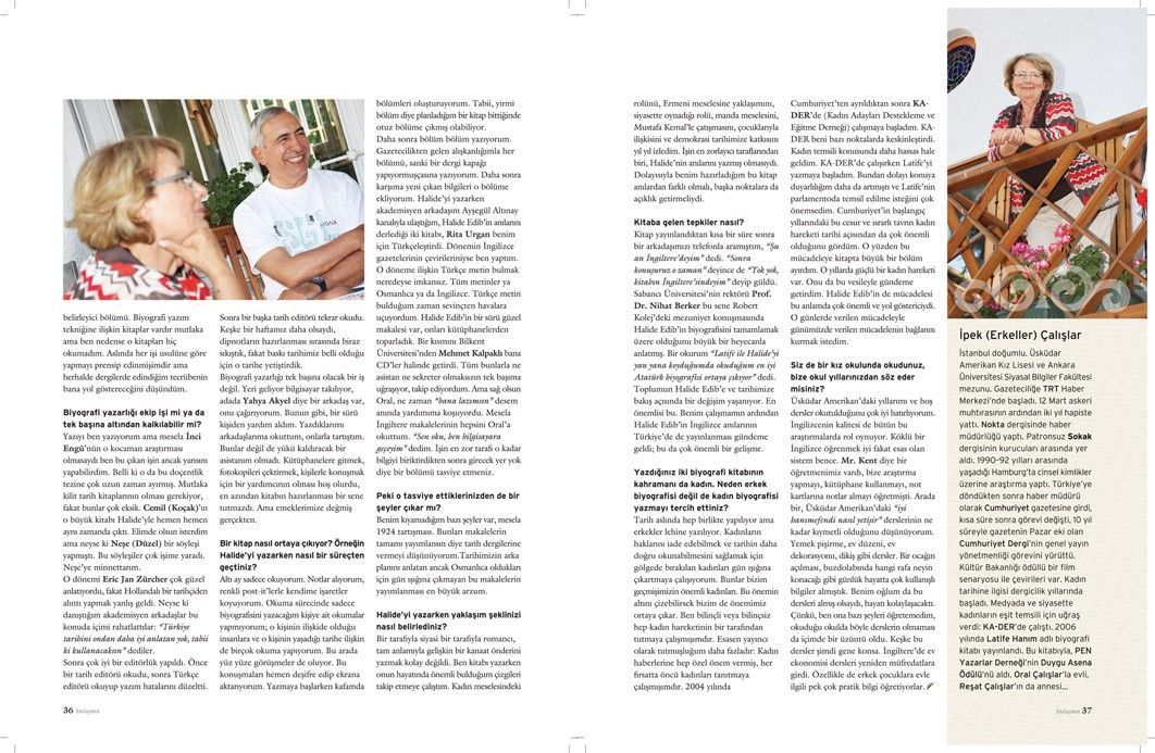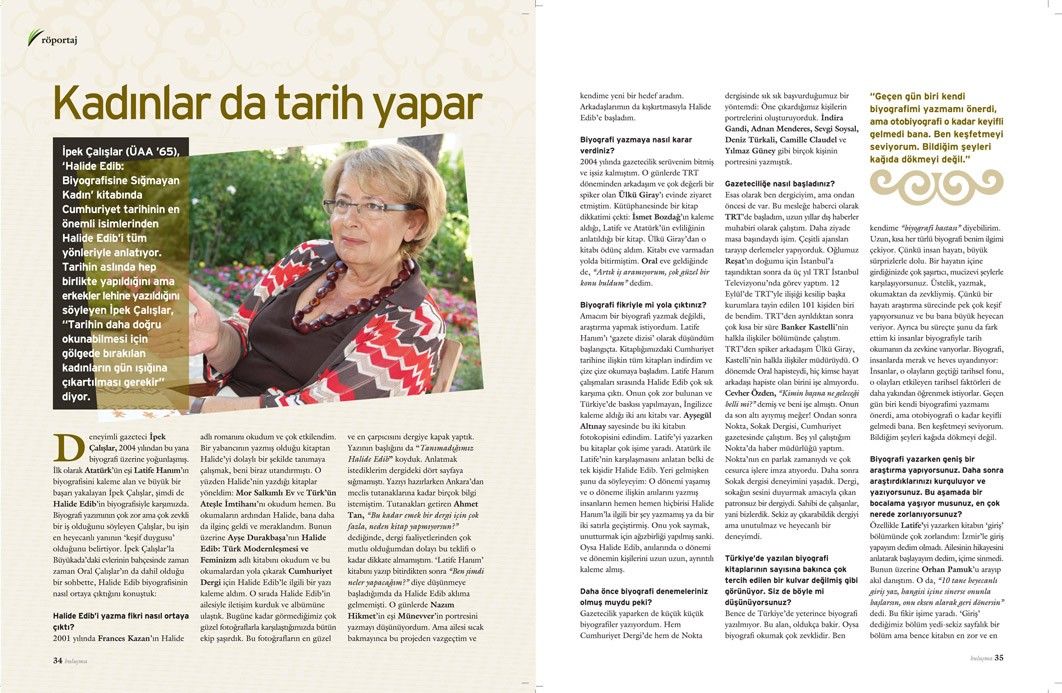 Deneyimli gazeteci İpek Çalışlar, 2004 yılından bu yana biyografi üzerine yoğunlaşmış. İlk olarak Atatürk’ün eşi Latife Hanım’ın biyografisini kaleme alan ve büyük bir başarı yakalayan İpek Çalışlar, şimdi de Halide Edib’in biyografisiyle karşımızda. Biyografi yazımının çok zor ama çok zevkli bir iş olduğunu söyleyen Çalışlar, bu işin en heyecanlı yanının ‘keşif duygusu’ olduğunu belirtiyor. İpek Çalışlar’la Büyükada’daki evlerinin bahçesinde zaman zaman Oral Çalışlar’ın da dahil olduğu bir sohbette, Halide Edib biyografisinin nasıl ortaya çıktığını konuştuk: