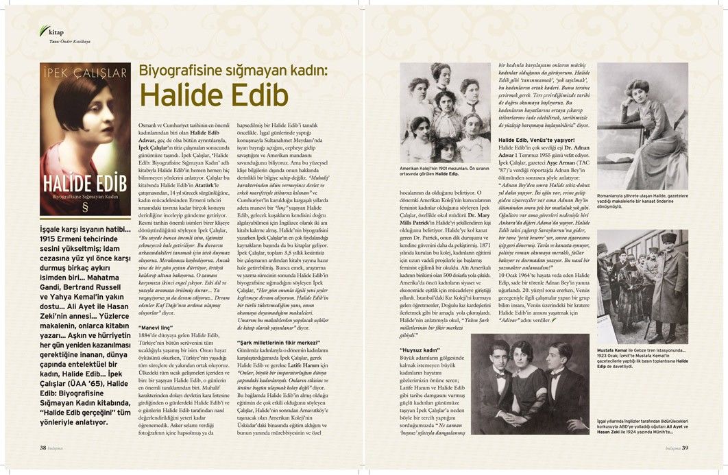 Osmanlı ve Cumhuriyet tarihinin en önemli kadınlarından biri olan Halide Edib Adıvar, geç de olsa bütün ayrıntılarıyla, İpek Çalışlar’ın titiz çalışmaları sonucunda günümüze taşındı. İpek Çalışlar, ‘Halide Edib: Biyografisine Sığmayan Kadın’ adlı kitabıyla Halide Edib’in hemen hemen hiç bilinmeyen yönlerini anlatıyor. Çalışlar bu kitabında Halide Edib’in Atatürk’le çatışmasından, 14 yıl sürecek sürgünlüğüne, kadın mücadelesinden Ermeni tehciri sırasındaki tavrına kadar birçok konuyu derinliğine inceleyip gündeme getiriyor. Resmi tarihin önemli isimleri birer klişeye dönüştürdüğünü söyleyen İpek Çalışlar, “Bu sayede bunca önemli isim, ilgimizi çekmeyecek hale getiriliyor. Bu duvarın arkasındakileri tanımak için istek duymaz oluyoruz. Merakımızı kaybediyoruz. Ancak yine de bir gün şeytan dürtüyor, örtüyü kaldırıp altına bakıyoruz. O zaman karşımıza ikinci engel çıkıyor. Eski dil ve yazıyla aramıza örülmüş duvar… Ya vazgeçiyoruz ya da devam ediyoruz… Devam edenler Kaf Dağı’nın ardına ulaşmış oluyorlar” diyor.