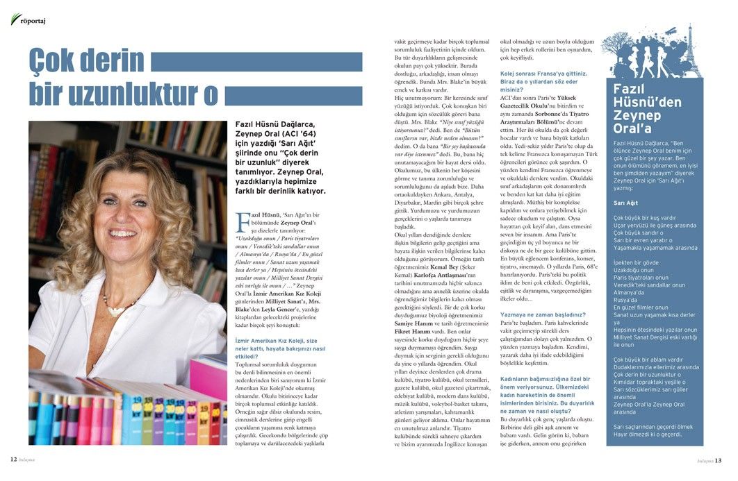 Fazıl Hüsnü, ‘Sarı Ağıt’ın bir bölümünde Zeynep Oral’ı şu dizelerle tanımlıyor: “Uzakdoğu onun / Paris tiyatroları onun / Venedik’teki sandallar onun / Almanya’da / Rusya’da / En güzel filmler onun / Sanat uzun yaşamak kısa derler ya / Hepsinin ötesindeki yazılar onun / Milliyet Sanat Dergisi eski varlığı ile onun / …” Zeynep Oral’la İzmir Amerikan Kız Koleji günlerinden Milliyet Sanat’a, Mrs. Blake’den Leyla Gencer’e, yazdığı kitaplardan gelecekteki projelerine kadar birçok şeyi konuştuk:
