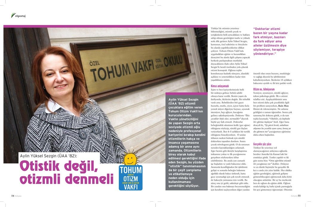 Türkiye’de otizmin yeterince bilinmediğini, otizmli çocuk ve yetişkinlerin belli ayrıcalıklara ve haklara sahip olması gerektiğini inatla ve yüksek sesle dile getiren Aylin Yüksel Sezgin, kamunun, özel sektörün ve bireylerin bu alanda yapabileceklerine dikkat çekiyor. Tohum Otizm Vakfı’nda uyguladıkları eğitim ve kazandıkları deneyimi bu alanla ilgili çalışma yapacak herkesle paylaşmaktan mutluluk duyacaklarını ifade eden Aylin Yüksel Sezgin’le kendi özelinden yola çıkarak otizmi konuştuk. Oğluna teşhis konuluncaya kadarki süreçten, alandaki açıklara ve yetersizliklere kadar tüm yaşadıklarını anlattı.