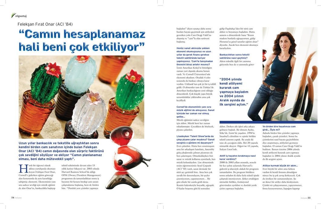 Hırslı bir öğrenci olarak aklına yurtdışında okumayı koyan Felekşan Onar, Cornell’e giderken eğitim göreceği alan konusunda da aynı kararlılığa sahipmiş: ekonomi. Ekonominin yanı sıra sadece sevdiği için müzik eğitimi de alan Onar, bankacılıkla başlayıp tekstil sektöründe devam eden 15 yıllık bir kariyere sahip. 2003 yılında Harvard’da aldığı OPM programını da tamamladıktan sonra iş hayatını bir kenara bırakıp cam sanatı çalışmalarına başlamış, hem de birden bire. “Durduk yere çizimler yapmaya başladım” diyen sanatçı daha sonra bunları hayata geçirmek için atölyeleri gezmeye başladığında yolu Cam Ocağı Vakfı’na düşmüş ve ”cam”la olan serüveni başlamış.