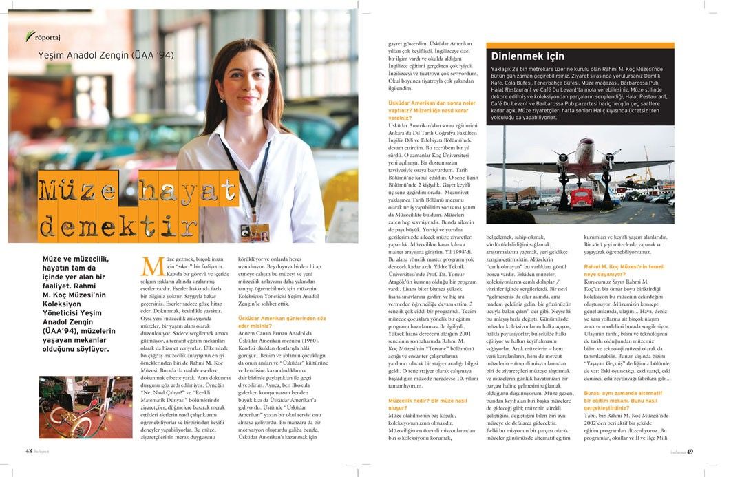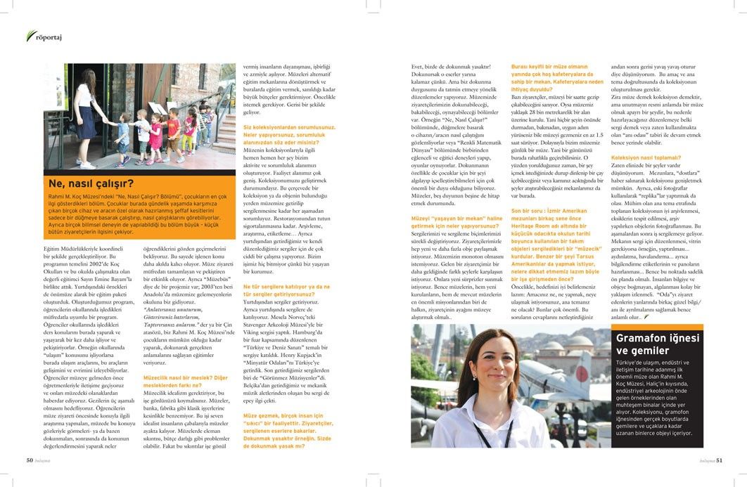 Müze gezmek, birçok insan için “sıkıcı” bir faaliyettir. Kapıda bir görevli ve içeride solgun ışıkların altında sıralanmış eserler vardır. Eserler hakkında fazla bir bilginiz yoktur. Saygıyla bakar geçersiniz. Eserler sadece göze hitap eder. Dokunmak, kesinlikle yasaktır. Oysa yeni müzecilik anlayışında müzeler, bir yaşam alanı olarak düzenleniyor. Sadece sergilemek amacı gütmüyor, alternatif eğitim mekanları olarak da hizmet veriyorlar. Ülkemizde bu çağdaş müzecilik anlayışının en iyi örneklerinden biri de Rahmi M. Koç Müzesi. Burada da nadide eserlere dokunmak elbette yasak. Ama dokunma duygusu göz ardı edilmiyor. Örneğin “Ne, Nasıl Çalışır?” ve “Renkli Matematik Dünyası” bölümlerinde ziyaretçiler, düğmelere basarak merak ettikleri aletlerin nasıl çalıştıklarını öğrenebiliyorlar ve birbirinden keyifli deneyler yapabiliyorlar. Bu müze, ziyaretçilerinin merak duygusunu körüklüyor ve onlarda heves uyandırıyor. Beş duyuya birden hitap etmeye çalışan bu müzeyi ve yeni müzecilik anlayışını daha yakından tanıyıp öğrenebilmek için müzenin Koleksiyon Yöneticisi Yeşim Anadol Zengin’le sohbet ettik.