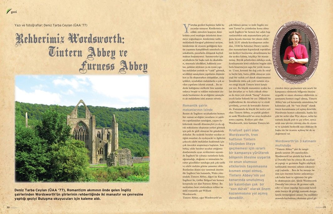 “Tintern Abbey” şiiri ile tanıştığımda sanırım 20 yaşındaydım; Wordsworth’un şiirdeki kız kardeşi Dorothy’nin bu yöreye ilk seyahatini yaptığı ve gezisinin İngiliz edebiyat tarihindeki önemini tahmin edemeyeceği yaşlarda… Ben de bu metnin benim için önemini henüz anlayamayacak kadar ham ve eğitimsiz bir gözle okumuştum şiiri. Şiirde Wordsworth Dorothy’nin yöreye ilk gezisine eşlik eder ve onun yaşadığı heyecanın kendisinin buraya ilk geldiği zamanki duygularıyla örtüştüğünü anlatır: bu yeşillikler arasında kaybolmuş yıkıntının güzel görüntüsü kız kardeşine de soğuk kış günlerinde, kalabalık kent yaşamında, adeta bir esin, sevinç ve umut kaynağı olacaktır. Ona göre Tintern Abbey, genç gezgine üç katmanlı bir mutluluk verecektir. Bu cömert ve doğal yeşillik, neşeli bir sesle akan nehir ve gözlerden ırak, bu kutsal mekân öncelikle Dorothy’ye, genç bir hayvanın doğada özgürce koşuşturmaktan alacağı zevke benzer bir tad verecektir. Ancak daha sonra, kışın karanlık günlerinde gözünde tekrar canlanacak görüntüler, uzun bir aradan sonra sıcak bir özlemle hatırlanan bir dost iyiliğini yeniden yaşatırcasına dokunacaktır kardeşine. Son olarak da şairin bu deneyimler ışığında tekrarladığı ziyarette olduğu gibi, Dorothy, hayata olgunlaşmış ve gelecekte tekrar yaşayacağı zevklerin tatlı beklentisi ile bakmayı öğrenecektir. Wordsworth şiirini kız kardeşinin de bu güzel mekânda kendisinin yıllardır bulduğu gibi derin bir doyum bulacağına ve ağabeyini anacağına olan inancını dile getirerek sonlandırır: