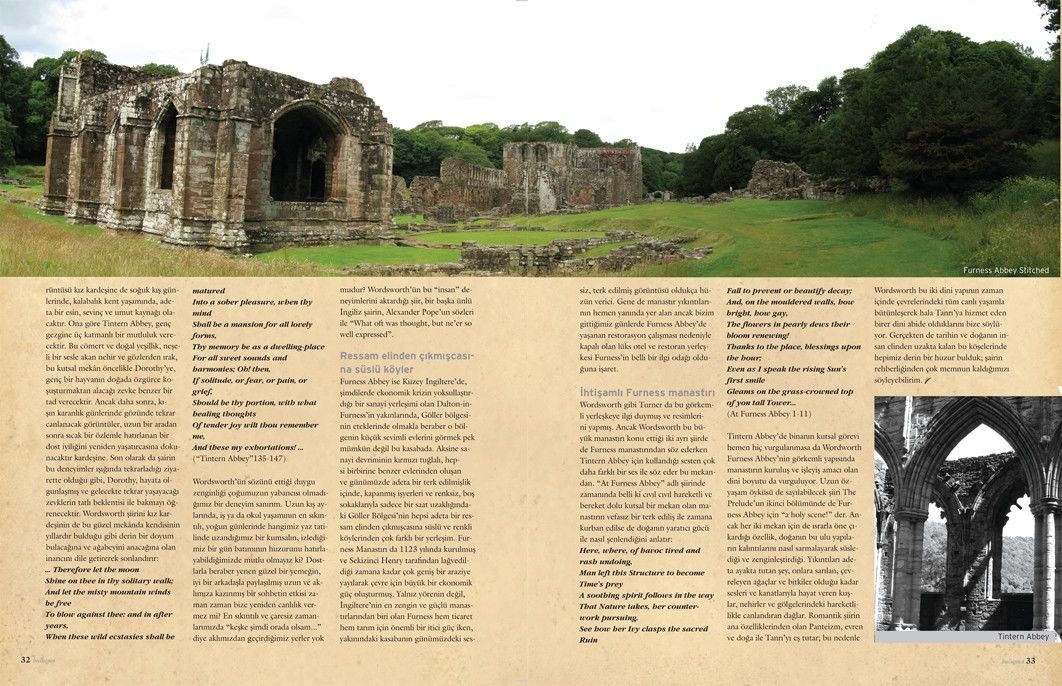 Benim de İngiltere seyahatlerim hemen her zaman sevdiğim yazarların ve şairlerin yapıtlarından tanıdığım, yaşam öykülerinde önemli dönemeçleri ya da uğrak noktalarını oluşturan yerleri görmek için pek de gizli olmayan bir gündemle doludur. Bu nedenle beraber seyahat ettiğim insanları da oyalayacak ve ilgilerini çekecek edebi mekânları keşfetmek için çok önceden araştırmaya başlarım. Son birkaç yıldır beraber seyahat ettiğimiz dostlarımızla uyan zevklerimiz sayesinde İngiltere’de yabancı turistlerin fazla uğramadığı, doğanın ve mimarinin beraber güzellikler sunduğu pek çok tarihi ve edebi mekânı görme şansımız oldu. Bunlardan ikisini size tanıtmak isterim: ilki İngiltere’nin batısında, Wales yöresindeki Tintern Abbey, diğeri ise Kuzey İngiltere’de, Göller Bölgesi’nin hemen kenarında yer alan Furness Abbey. Bu mekânlara beni yönlendiren rehber ise ünlü romantik şair William Wordsworth. Tintern Abbey, eğer Wordsworth’un çok bilinen şiirine ve ünlü İngiliz ressam Turner’ın çizimlerine konu olmasaydı İngiltere’de hemen her adım başı rastlanabilen eski manastırların pek çoğuna kıyasla önemsiz bir yıkıntı olabilirdi. 1131 yılında kuruluşunun ardından, 1536’da Sekizinci Henry tarafından manastırların kapatılarak topraklarının kraliyet hazinesine aktarılmasına kadar ayakta kalmış, küçükçe bir manastırmış. Büyük şehirlerden oldukça uzak, kentleşmenin kötü etkilerini bugün dahi fazla hissetmeyen sapa bir yerde manastır. Uzun, kıvrımlı bir dağ yolu ile etrafta hiçbir köy, hatta çiftlik olmayan yemyeşil bir vadide yol alarak ulaşıyorsunuz. Şimdilerde daha çok yerli turistin ziyaret ettiği küçük Tintern köyü karşılıyor sizi. Bu küçük manastırın ayakta kalan duvarları az ve fazla yüksek olmasa da ören yeri olarak “harap” denemeyecek kadar bakımlı bir yer. Dikkatli bir yeşillendirme ile duvarların içi ve etrafı çevrilmiş, çevresi de korunaklı durumda.