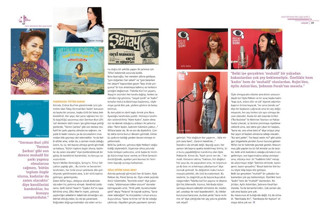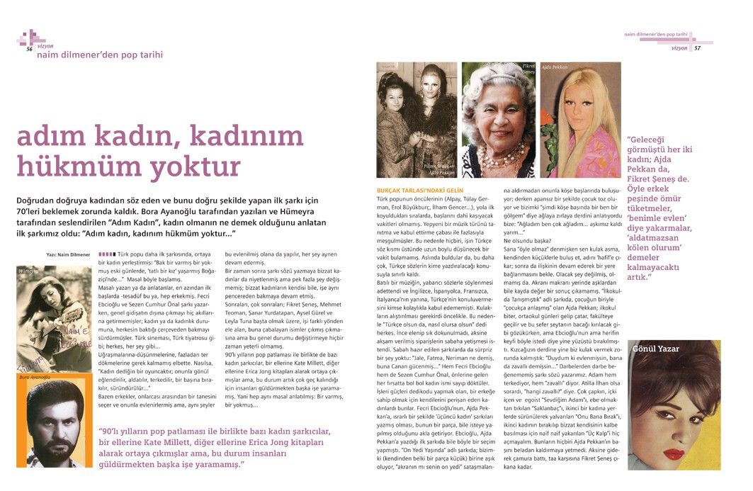 Türk popu daha ilk şarkısında, ortaya bir kadın yerleştirmiş: “Bak bir varmış bir yokmuş eski günlerde, ‘tatlı bir kız’ yaşarmış Boğaziçi’nde…” Masal böyle başlamış. Masalı yazan ya da anlatanlar, en azından ilk başlarda -tesadüf bu ya, hep erkekmiş. Fecri Ebcioğlu ve Sezen Cumhur Önal şarkı yazarken, genel gidişatın dışına çıkmayı hiç akıllarına getirmemişler; kadın ya da kadınlık durumuna, herkesin baktığı çerçeveden bakmayı sürdürmüşler. Türk sineması, Türk tiyatrosu gibi; herkes, her şey gibi… Uğraşmalarına-düşünmelerine, fazladan ter dökmelerine gerek kalmamış elbette. Nasılsa, “Kadın dediğin bir oyuncaktır; onunla gönül eğlendirilir, aldatılır, terk edilir, bir başına bırakılır, süründürülür…” Bazen erkekler, onlarcası arasından bir tanesini seçer ve onunla evlenirlermiş ama, aynı şeyler bu evlenilmiş olana da yapılır, her şey aynen devam edermiş. Bir zaman sonra şarkı sözü yazmaya bizzat kadınlar da niyetlenmiş ama pek fazla şey değişmemiş; bizzat kadınların kendisi bile, işe aynı pencereden bakmaya devam etmiş. Sonraları, çok sonraları; Fikret Şeneş, Mehmet Teoman, Şanar Yurdatapan, Aysel Gürel ve Leyla Tuna başta olmak üzere, işi farklı yönden ele alan, buna çabalayan isimler çıkmış çıkmasına ama bu genel durumu değiştirmeye hiçbir zaman yeterli olmamış. 90’lı yılların pop patlaması ile birlikte de bazı kadın şarkıcılar, bir ellerine Kate Millett, diğer ellerine Erica Jong kitapları alarak ortaya çıkmışlar ama, bu durum artık çok geç kalındığı için insanları güldürmekten başka işe yaramamış. Yani hep aynı masal anlatılmış: Bir varmış, bir yokmuş…