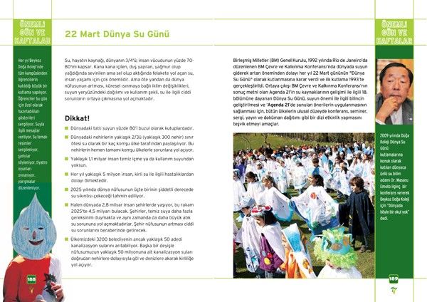 Tetra İletişim, 2011 yılında Doğa Koleji için “Tarım Ders Kitabı” (ISBN: 978-605-4524-76-1) hazırladı. Kitap, Ayfer Erdem Batı, Prof. Dr. Rahim Anşin, Ziraat Yük. Müh. Tolga Özdemir, Peyzaj Mimarı Suzan Saygılı, Ziraat Tek. Merve Tombul ve Vecdi Erbay’dan oluşan bir ekip tarafından kaleme alındı. Kitabın redaksiyonuysa Ayşen Türkmen, Vecdi Erbay ve Ersin Toker tarafından yapıldı. Didem İncesağır ise kitabın grafik tasarım ve uygulamasını gerçekleştirdi. “22 Mart: Dünya Su Günü” adlı konu, kitabın 188. sayfasında yer alıyor.