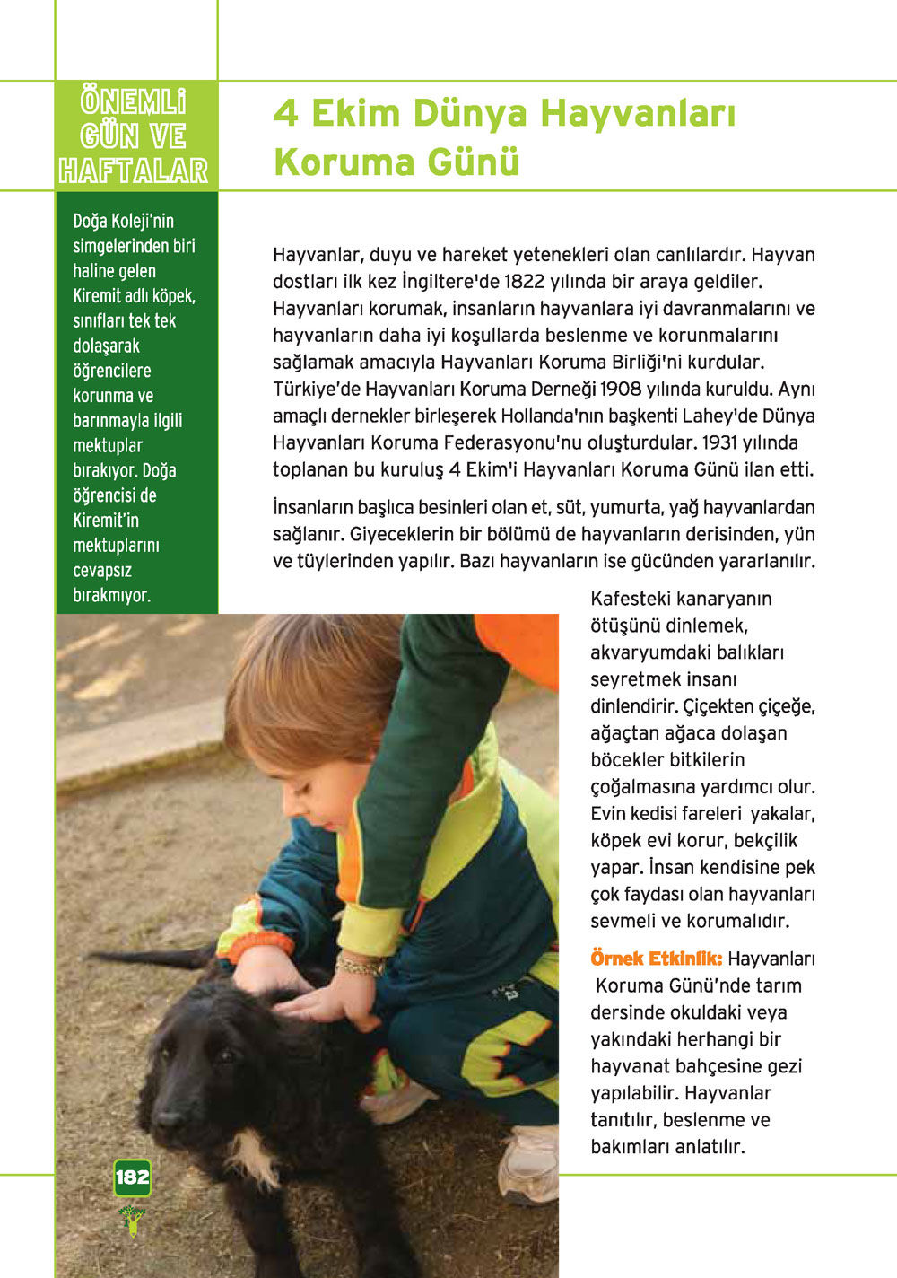 Örnek Etkinlik: Hayvanları Koruma Günü’nde tarım dersinde okuldaki veya yakındaki herhangi bir hayvanat bahçesine gezi yapılabilir. Hayvanlar tanıtılır, beslenme ve bakımları anlatılır.