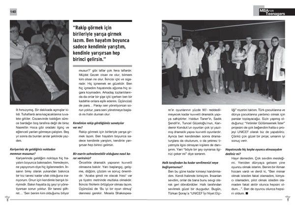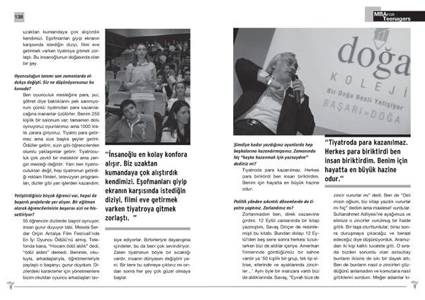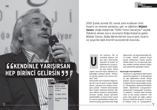 Doğa Koleji’nde uygulanan t-MBA Modeli, öğrencileri geleceğe hazırlıyor. Bu çerçevede öğrenciler, mesleklerinde başarıya ulaşmış insanlarla bir araya gelip söyleşiyor. Bu toplantı ve buluşmalar, Tetra İletişim tarafından izlenip kayıt altına alınıyor. Yıl sonunda tüm konular, bir kitapta toplanıyor. Müjdat Gezen’le Doğa öğrencilerinin buluşması 2009 -2010 eğitim döneminde gerçekleşti. Buluşma, Türkşan Karatekin tarafından izlendi ve Cihan Aldık tarafından fotoğraflandı. Konunun ve kitabın editörlüğünü Türkşan Karatekin yaptı. Kitap tasarımı ve uygulaması ise Didem İncesağır’a ait.