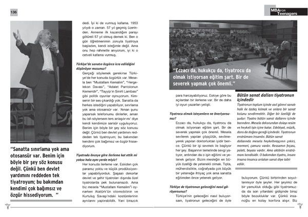 Ben oyunculuk mesleğine para, pul, şöhret diye baktıklarını pek sanmıyorum çünkü tiyatrodan para kazanılacağına inananlar üzülürler. Benim 250 kişilik bir salonum var; tamamen dolu oynuyoruz oyunlarımızı ama 1000 liralık zarara giriyoruz. Tiyatro para getirmez ama size başka şeyler getirir. Ödüller getirir, sizin gibi öğrencilerden olumlu yaklaşımlar getirir. Tiyatroculuk çok zevkli bir meslektir ama zengin mesleği değildir. Yani ben tiyatroculuktan değil, hep tiyatronun getirdiği reklam filmleri, televizyon programları, diziler gibi yan işlerden kazandım.