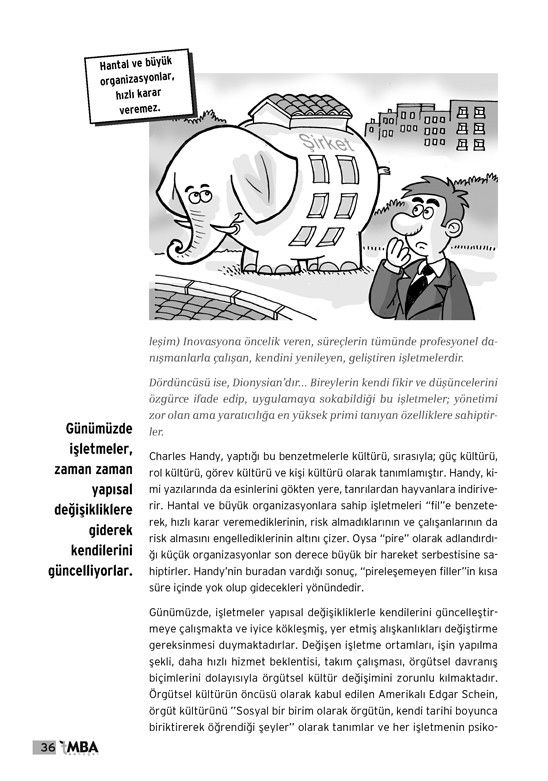 Charles Handy, yaptığı bu benzetmelerle kültürü, sırasıyla; güç kültürü, rol kültürü, görev kültürü ve kişi kültürü olarak tanımlamıştır. Handy, kimi yazılarında da esinlerini gökten yere, tanrılardan hayvanlara indiriverir. Hantal ve büyük organizasyonlara sahip işletmeleri “fil”e benzeterek, hızlı karar veremediklerinin, risk almadıklarının ve çalışanlarının da risk almasını engellediklerinin altını çizer. Oysa “pire” olarak adlandırdığı küçük organizasyonlar son derece büyük bir hareket serbestisine sahiptirler. Handy’nin buradan vardığı sonuç, “pireleşemeyen filler”in kısa süre içinde yok olup gidecekleri yönündedir.