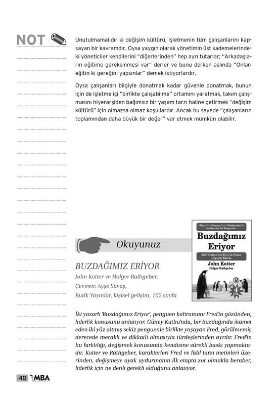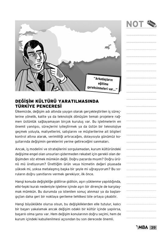 Doğa Koleji’nde uygulanan t-MBA Modeli, öğrencileri geleceğe hazırlıyor. Tetra İletişim, bu model için müfredat kitapları hazırladı. Burada yer verdiğimiz “Değişim Kültürü” adlı konu, “Değişim Mühendisliği ve Pazarlama” (ISBN: 978-605-4101-23-8) adlı kitabın 35. sayfasında yer alıyor. Ersin Toker tarafından kaleme alınan kitabın tasarım ve grafik uygulamasını Didem İncesağır yaptı. Kitaptaki çizimler Ender Özkahraman ve Behzat Taş’a ait.