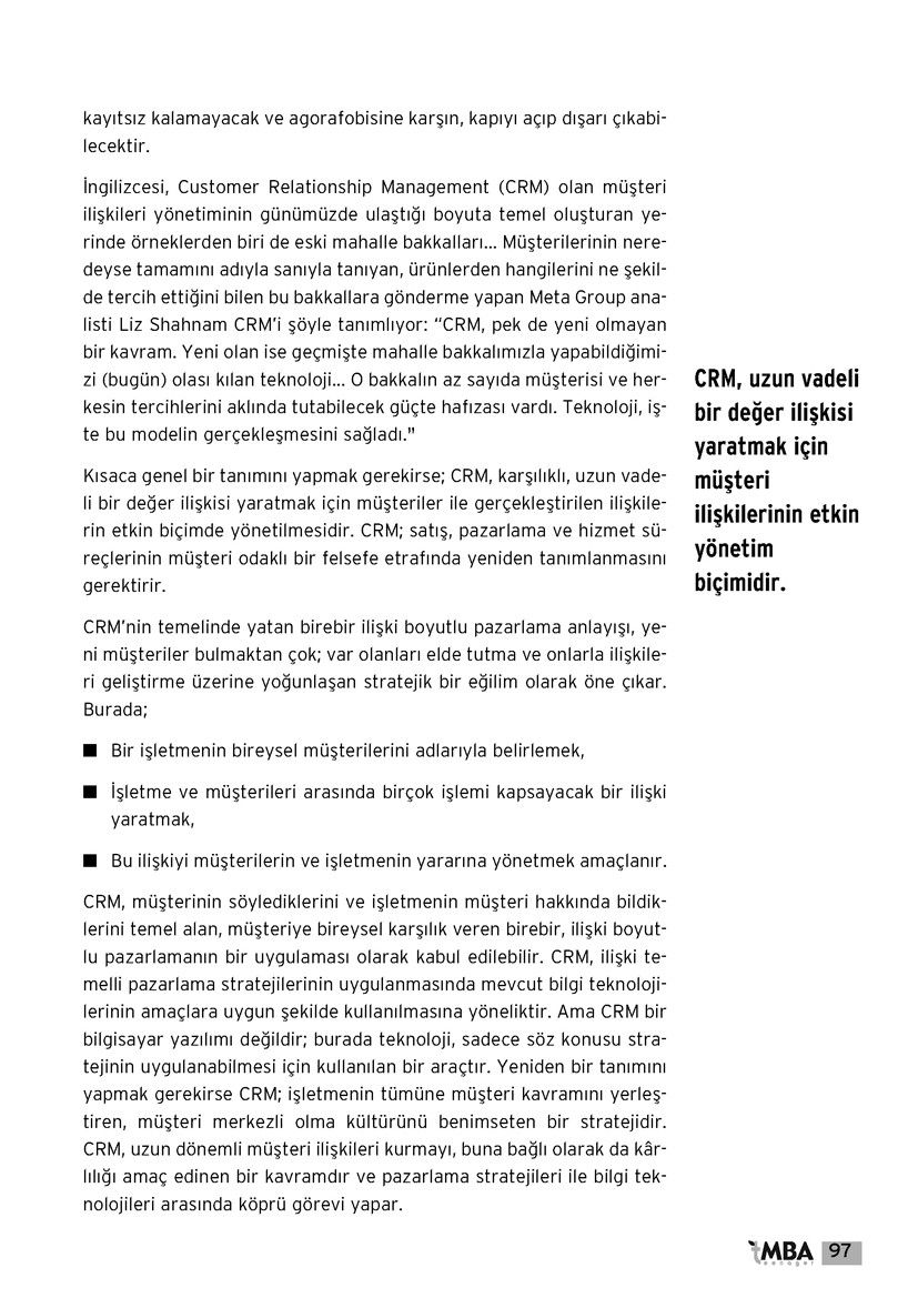 İngilizcesi, Customer Relationship Management (CRM) olan müşteri ilişkileri yönetiminin günümüzde ulaştığı boyuta temel oluşturan yerinde örneklerden biri de eski mahalle bakkalları… Müşterilerinin neredeyse tamamını adıyla sanıyla tanıyan, ürünlerden hangilerini ne şekilde tercih ettiğini bilen bu bakkallara gönderme yapan Meta Group analisti Liz Shahnam CRM’i şöyle tanımlıyor: “CRM, pek de yeni olmayan bir kavram. Yeni olan ise geçmişte mahalle bakkalımızla yapabildiğimizi (bugün) olası kılan teknoloji… O bakkalın az sayıda müşterisi ve herkesintercihlerini aklında tutabilecek güçte hafızası vardı. Teknoloji, işte bu modelin gerçekleşmesini sağladı.”