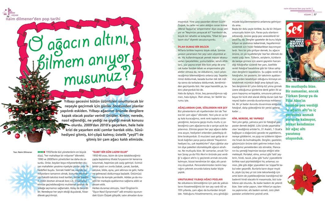 Başka bir dolu şeyle birlikte, bu da bir ihtişam unsuruydu bizim için. Parası pulu olanların edineceği, önüne geçip poz vereceklerdi bir şeydi bu da. Dergiler gazeteler de bunu böyle biliyor ve iştahımızı kabartmak, hayallerimizi süslemek için hiçbir fedakarlıktan kaçınmıyorlardı. Yeni bir yıla giriliyor demek, bu ağacın önüne, en şık kıyafetleriyle ‘star’ları dikmek demekti çoğu kere. Tüllerin, otrişlerin, kürklerin de kareye girmesi için azami gayretin harcandığı fotoğraflar süslerdi her yanı, özellikle renkli fotoğraf basabilme gibi bir lükse sahip olan dergilerin kapaklarını. Şu çağda; renkli bir fotoğrafın, bir posterin, bir takvimin ayaklarımızı yerden kesebiliyor olduğunu kimseye anlatabilmek mümkün değil ama öyleydi işte…