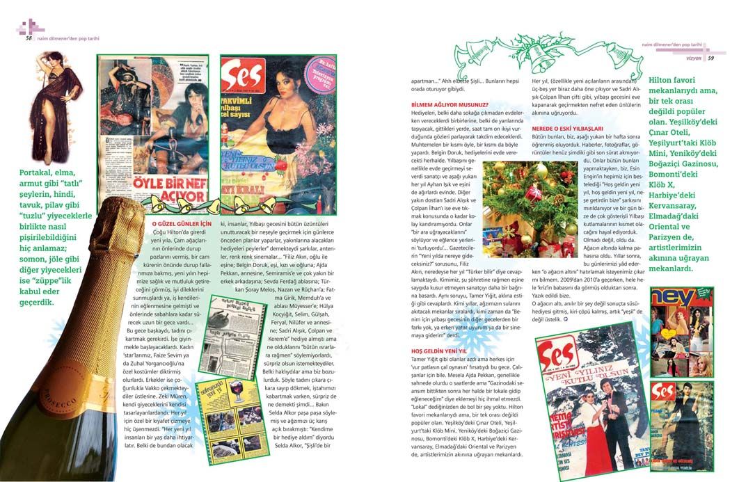 Çoğu Hilton’da girerdi yeni yıla. Çam ağaçlarının önlerinde durup pozlarını vermiş, bir cam kürenin önünde durup fallarımıza bakmış, yeni yılın hepimize sağlık ve mutluluk getireceğini görmüş, iyi dileklerini sunmuşlardı ya, iş kendilerinin eğlenmesine gelmişti ve önlerinde sabahlara kadar sürecek uzun bir gece vardı… Bu gece başkaydı, tadını çıkartmak gerekirdi. İşe giyinmekle başlayacaklardı. Kadın ‘star’larımız, Faize Sevim ya da Zuhal Yorgancıoğlu’na özel kostümler diktirmiş olurlardı. Erkekler ise çoğunlukla Vakko çekmekteydiler üstlerine. Zeki Müren, kendi giyeceklerini kendisi tasarlayanlardandı. Her yıl için özel bir kıyafet çizmekten hiç üşenmezdi. “Her yeni yıl insanları bir yaş daha ihtiyarlatır. Belki de bundan olacak ki, insanlar, Yılbaşı gecesini bütün üzüntüleri unutturacak bir neşeyle geçirmek için günlerce önceden planlar yaparlar, yakınlarına alacakları hediyeleri peylerler” demekteydi şarkılar, antenler, renk renk sinemalar… “Filiz Akın, oğlu ile eşine; Belgin Doruk, eşi, kızı ve oğluna; Ajda Pekkan, annesine, Semiramis’e ve çok yakın bir erkek arkadaşına; Sevda Ferdağ ablasına; Türkan Şoray Meloş, Nazan ve Rüçhan’a; Fatma Girik, Memduh’a ve ablası Müyesser’e; Hülya Koçyiğit, Selim, Gülşah, Feryal, Nilüfer ve annesine; Sadri Alışık, Çolpan ve Kerem’e” hediye almıştı ama ne olduklarını “bütün ısrarlara rağmen” söylemiyorlardı, sürpriz olsun istemekteydiler. Belki haklıydılar ama biz bozulurduk. Şöyle tadını çıkara çıkara sayıp dökmek, iştahımızı kabartmak varken, sürpriz de ne demekti şimdi… Bakın Selda Alkor paşa paşa söylemiş ve ağzımızı üç karış açık bırakmıştı: “Kendime bir hediye aldım” diyordu Selda Alkor, “Şişli’de bir apartman…” Ahh elbette Şişli… Bunların hepsi orada oturuyor gibiydi.