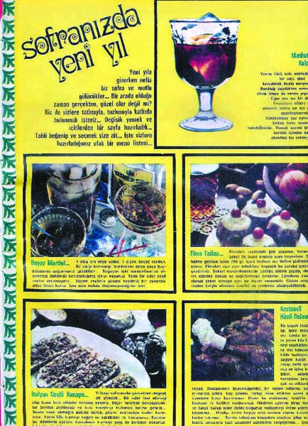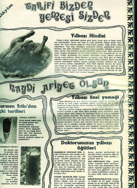 Yeni yılın gelişi, yalnızca yeni bir fotoğraf-poz-poster demek değildi. Lüks içinde yaşamakta olan “sevdiğimiz artisler”in, 31 Aralık’ı, 1 Ocak’a bağlayan o olağanüstü gecede ne yaptıklarını, nereye gittiklerini, ne yiyip ne içtiklerini öğrenme fırsatı da bulmaktaydık… Dergiler, gazeteler, gözümüzün önüne dahi getirme imkanı bulamadığımız yemeklerden söz etmekte, filancanın bu yemeği hepimize tavsiye ettiğini eklemekteydi. Portakal, elma, armut gibi “tatlı” şeylerin, hindi, tavuk, pilav gibi “tuzlu” yiyeceklerle birlikte nasıl pişirilebildiğini hiç anlamaz; somon, jöle gibi diğer yiyecekleri ise “züppe”lik kabul eder geçerdik. Bunlarla karın doyar mıydı ki, şöyle (üç-beş yıl üst üste tekrarlandığı için artık bizim de yiyebileceğimize inandığımız) bir bademli hindi olacaktı ki masamızda, bizi tutabilene aşk olsundu. Bu kadar badem de yeterdi bize. İster onlar yapsın, ister Hilton’un aşçılarına yaptırsınlar, altı badem ezmeli, üstü jöleli pastaları artistlerimiz yesindi artık…