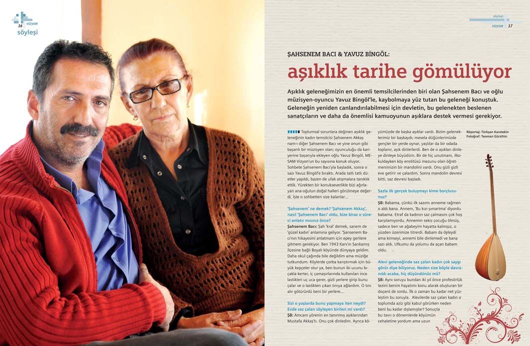 Toplumsal sorunlara değinen aşıklık geleneğinin kadın temsilcisi Şahsenem Akkaş nam-ı diğer Şahsenem Bacı ve yine onun gibi başarılı bir müzisyen olan; oyunculuğu da kariyerine başarıyla ekleyen oğlu Yavuz Bingöl, MESAM Vizyon’un bu sayısının kapak konusu.