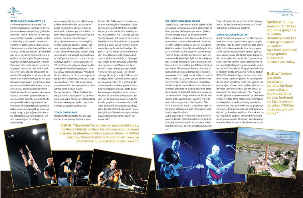 Sohbete doğal olarak Hasankeyf’teki konserle başlıyoruz. Gerimizdeki televizyonda da konserden çekilmiş görüntüler oynamaya başlıyor. “Nasıldı” diyorum, “o heyecan, o coşku? “İşte” diyorlar, ekrandaki coşkulu kalabalığı işaret ederek. Gerçekten kendinden geçmişçesine alkışlayan, şarkılara tempo tutan bir dinleyici kitlesi var ekranda. İyi de ben onların şarkılarındaki gibi şiirsel deyişlerle zenginleştirilmiş bir gözlemi ve yine böylesi bir yorumlayışı duymak için sabırsızlanıyorum. Nihayet Kutlu’nun söze başlamasıyla muradıma eriyorum: “Aynı anda hem 10 bin yıllık bir tarihin yanı başında olmak hem de çok özel bir coğrafyanın içinde şarkı söylemek ister istemez etkiliyor insanı. Burada birçok ünlü sanatçı gibi bizim de konser vermemizdeki öncelikli amaç, Hasankeyf’in sular altında kalarak böylesine büyük tarihsel bir mirasın bir süre sonra insanlar tarafından görülemeyecek olmasına dikkat çekmek, bununla ilgili kamuoyundaki farkındalığı artırmak ve mümkünse bu gidişi tersine çevirmekti. İyi bir amaç için oradaydık ve bunun yarattığı duygu yoğunluğuna daha önce hiç çalmadığınız ve nasıl olacağını tahmin edemediğiniz bir dinleyici profiliyle birlikte olmanın getirdiği heyecan eklenince yaşadığımız deneyim daha bir anlam kazandı. Kendi adıma enerjisi yüksek ve çok keyifli bir konser geçirdim. Bazen sahnedeyken seyircinin coşkusuyla kendinden geçersiniz ya, işte benim bunu yaşamama ramak kalmıştı diyebilirim. Bütün bu farklı farklı heyecan ve meraklar her birimiz için çok ama çok anlamlıydı.”