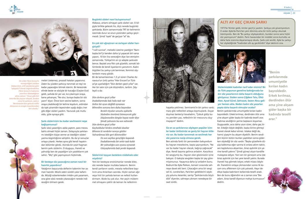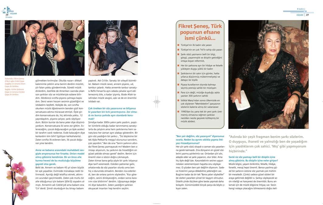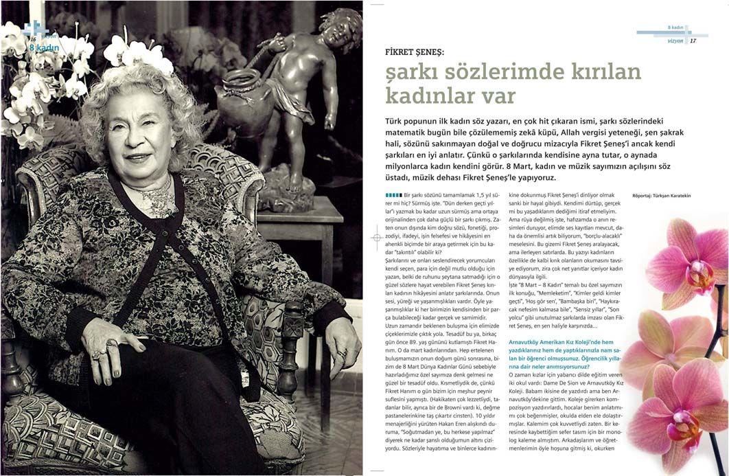 Bir şarkı sözünü tamamlamak 1,5 yıl sürer mi hiç? Sürmüş işte. “Dün derken geçti yıllar”ı yazmak bu kadar uzun sürmüş ama ortaya orijinalinden çok daha güçlü bir şarkı çıkmış. Zaten onun dışında kim doğru sözü, fonetiği, prozodiyi, ifadeyi, işin felsefesi ve hikâyesini en ahenkli biçimde bir araya getirmek için bu kadar “takıntılı” olabilir ki? Şarkılarını ve onları seslendirecek yorumcuları kendi seçen, para için değil mutlu olduğu için yazan, belki de ruhunu şeytana satmadığı için o güzel sözlere hayat verebilen Fikret Şeneş kırılan kadının hikâyesini anlatır şarkılarında. Onun sesi, yüreği ve yaşanmışlıkları vardır. Öyle yaşanmışlıklar ki her birimizin kendisinden bir parça bulabileceği kadar gerçek ve samimidir. Uzun zamandır beklenen buluşma için elimizde çiçeklerimizle çıktık yola. Tesadüf bu ya, birkaç gün önce 89. yaş gününü kutlamıştı Fikret Hanım. O da mart kadınlarından. Hep ertelenen buluşmamızın onun doğum günü sonrasına, bizim de 8 Mart Dünya Kadınlar Günü sebebiyle hazırladığımız özel sayımıza denk gelmesi ne güzel bir tesadüf oldu. Kısmetliydik de, çünkü Fikret Hanım o gün bizim için meşhur peynir suflesini yapmıştı. (Hakikaten çok lezzetliydi, tadanlar bilir, ayrıca bir de Browni vardı ki, değme pastanelerinkine taş çıkartır cinsten). 10 yıldır menajerliğini yürüten Hakan Eren alışkındı duruma, “Soğutmadan ye, bu herkese yapılmaz” diyerek ne kadar şanslı olduğumun altını çiziyordu. Sözleriyle hayatıma ve binlerce kadınınkine dokunmuş Fikret Şeneş’i dinliyor olmak sanki bir hayal gibiydi. Kendimi dürtüp, gerçek mi bu yaşadıklarım dediğimi itiraf etmeliyim. Ama rüya değilmiş işte, hafızamda o anın resimleri duruyor, elimde ses kayıtları mevcut, daha da önemlisi artık biliyorum, “borçlu-alacaklı” meselesini. Bu gizemi Fikret Şeneş aralayacak, ama ilerleyen satırlarda. Bu yazıyı kadınların özellikle de kalbi kırık olanların okumasını tavsiye ediyorum, zira çok net yanıtlar içeriyor kadın dünyasıyla ilgili. İşte “8 Mart – 8 Kadın” temalı bu özel sayımızın ilk konuğu, “Memleketim”, “Kimler geldi kimler geçti”, ‘Hoş gör sen’, “Bambaşka biri”, “Haykıracak nefesim kalmasa bile”, “Sensiz yıllar”, “Son yolcu” gibi unutulmaz şarkılarda imzası olan Fikret Şeneş, en şen haliyle karşınızda…