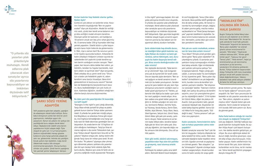 “I will survive”, melodisi üzerine yazdığım “Bambaşka biri”yi benden daha iyi yapacak biri varsa yapsın, 10 bin lira vereceğim diye ilan etmiştim zamanında. Türkiye’nin en iyi adapte şarkısıdır bence. Baştaki ana fikir çok güzeldir, sonraki bölümlerde de kendi isyanlarımı yansıtırım. Kadın örgütleri bu şarkıyı çok benimser, feminist söylemlerin marşı gibidir. Bir de tamamlanması 1,5 yıl süren Charles Aznavour’un ünlü şarkısı “Hier Encore”un Türkçe’ye uyarladığım “Dün derken geçti yıllar” var. Her bir satırı için çok düşündüm, tarttım. Şöyleydi o da: